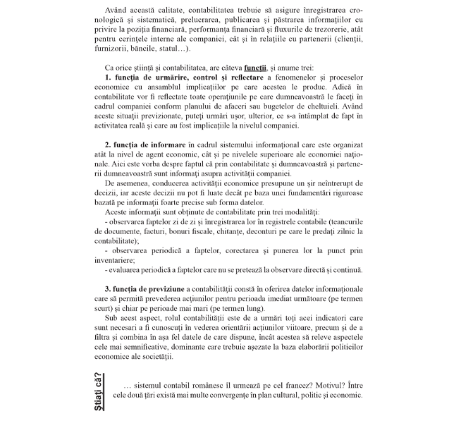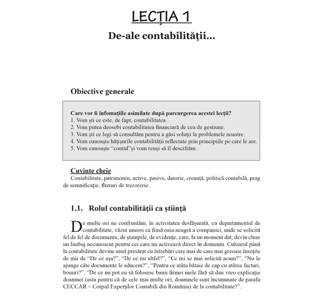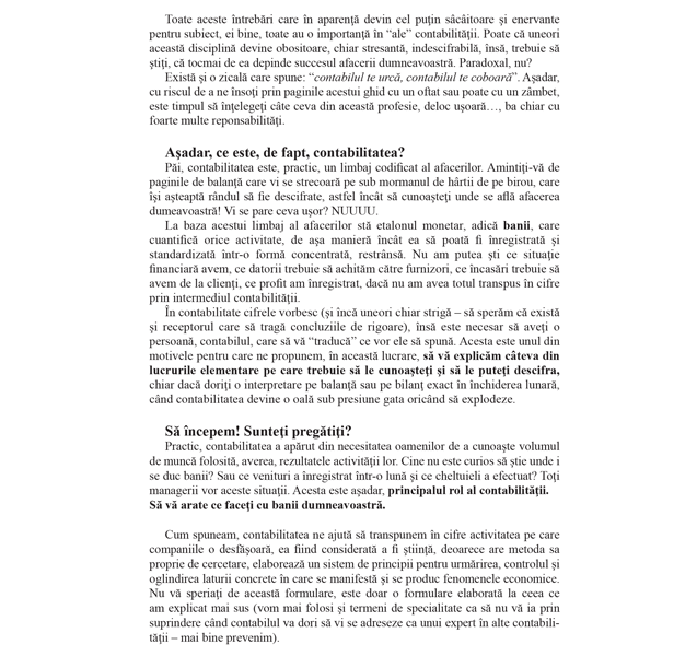 În manualul de faţă veţi găsi de la explicaţii ale unor termeni generali specifici domeniului contabil, la aspecte practice care vă ajute în activitatea zilnică. De exemplu, un capitol este dedicat în mod special managementului financiar, acea ramură din domeniul economic care vă ajută să învăţaţi cum să conduceţi compania şi cum să luaţi cele mai bune decizii financiare atunci când doriţi o creştere a profitului.