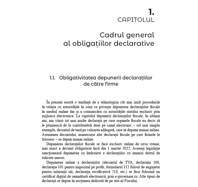 2. Atenționări speciale privind completarea și depunerea declarațiilor – în cele peste 300 de pagini, vom trece în revistă majoritatea declarațiilor fiscale ce ridică probleme la depunere. Le vom exemplifica modul de completare și vom clarifica cazurile în care trebuie depuse și termenele, astfel încât procesul de transmitere la ANAF să decurgă cât mai facil și rapid pentru dvs. Printre declarațiile discutate în acest volum se regăsesc: D406 – SAF-T, D398 – OSS, Declarația 112, Declarația 390 VIES și altele.