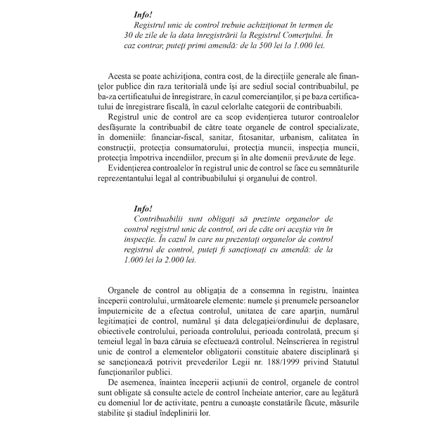 Printre responsabilităţile dvs ca administrator se află şi aceea de a fi pregătit întotdeauna pentru un eventual control din partea autorităţilor. Știm ca aveţi toate actele în regulă, dar ne-am gândit ca v-ar fi extrem de utilă lista documentelor solicitate de inspectorii care va pot calca pragul. Cartea “Documente obligatorii în cazul unui control” a fost concepută cu scopul de a va oferi această listă, însoţită de explicaţii practice de întocmire corectă a documentelor.