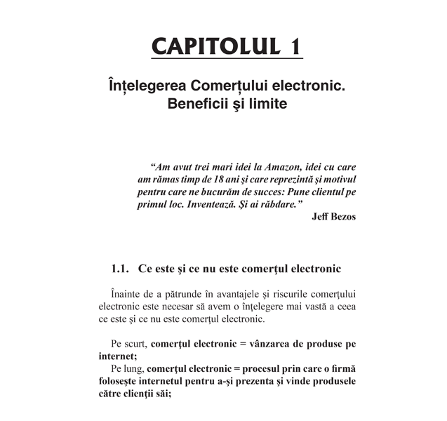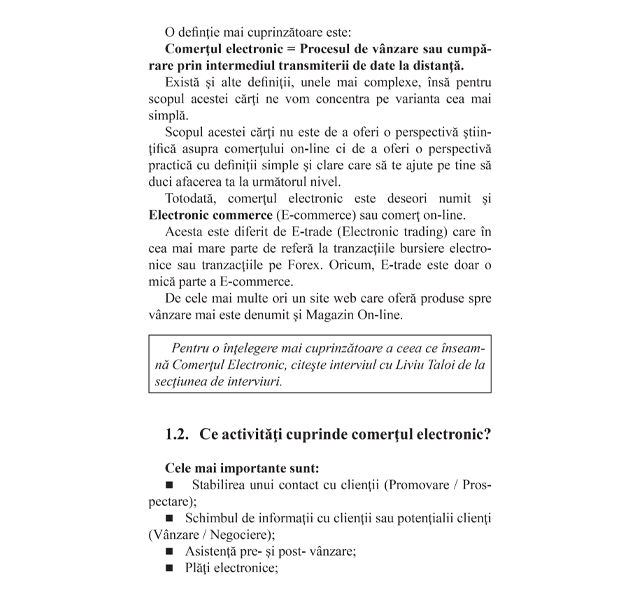 Această carte vă oferă o imagine completă a comerțului online în România așa cum este el. Fără înflorituri. Fără înfrumusețări. Descoperim şi discutăm atât barierele legale şi juridice ale dezvoltării unui magazin online cât şi toate elementele necesare dezvoltării unui magazin online de succes: de la implementare până la marketing.