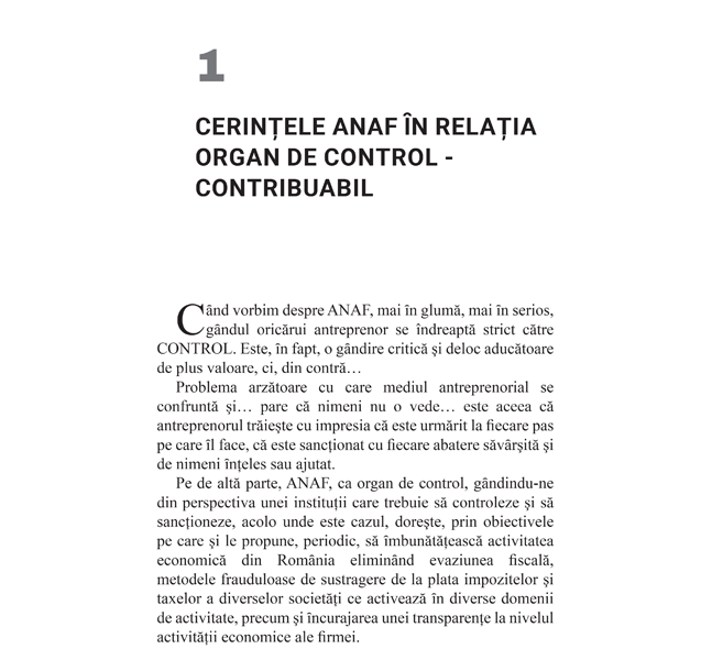 „Cand vorbim despre ANAF, mai in gluma, mai in serios, gandul oricarui antreprenor se indreapta strict catre CONTROL. Este, in fapt, o gandire critica si deloc aducatoare de plus valoare, ci, din contra… Relatia contribuabilului cu ANAF este una simpla, dar complicata, de tipul dragoste cu nabadai.